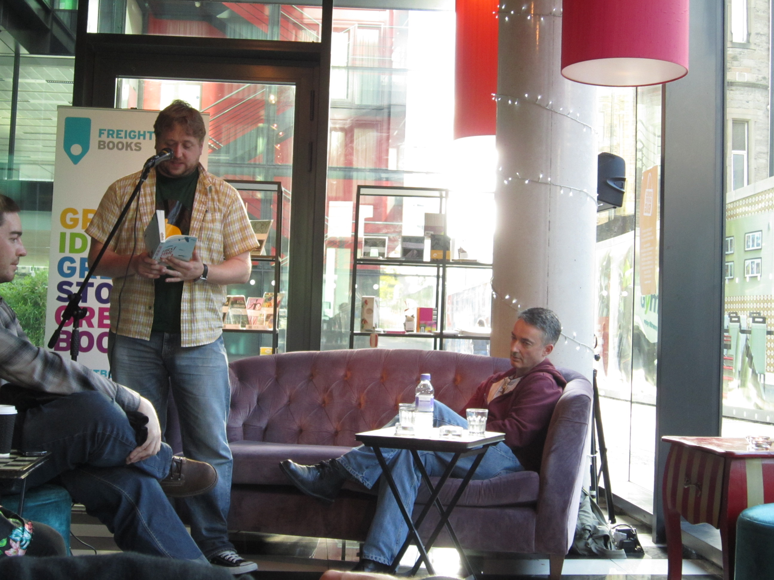 The reading was at No Alibis Bookstore, run by Dave, a friend of Lisa’s. I knew little about the shop but when he started talking about people they’d had read there recently (Ian Rankin etc) I began to feel a little intimidated. However he put me at ease by telling me that he’d already sold a couple of copies just from people spotting the bright cover on the shelf and saying ‘oh, what’s that?’ A victory for Freight’s designers.